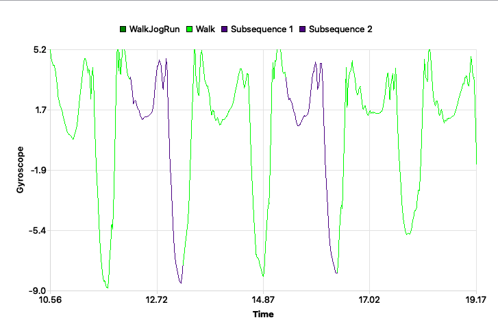 In diesem Beispiel verwenden wir Gyroskop-Daten von einer Studie, in der ein Mensch zuerst geht, dann joggt und schließlich läuft. Die Werte der Time Series stammen von einem Unterarmsensor und wurden im SeriesExplorer bereits in Aktivitäten segmentiert. Mehr erfahren …