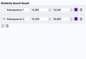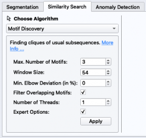 Nachdem der Similarity Search Algorithmus die Gyroskop-Daten analysiert hat, zeigt uns der SeriesExplorer eine Gruppe ähnlicher Strukturen in der Time Series. Wir können die Eigenschaften bei Bedarf bearbeiten, um spezielle Anpassungen vorzunehmen.